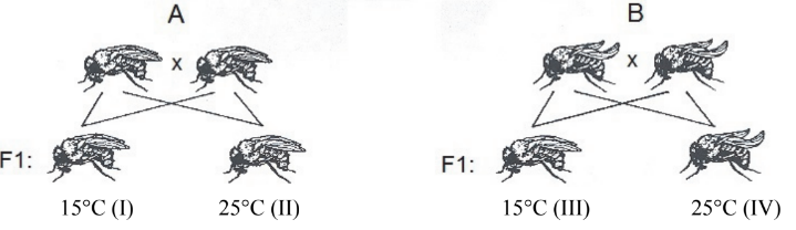 Przeprowadzono badanie, w którym skrzyżowano homozygotyczne muszki owocowe, mające allele dominujące (K) – warunkujące skrzydła proste (krzyżówka A) oraz homozygotyczne muszki owocowe, mające allele recesywne (k) – warunkujące skrzydła odgięte (krzyżówka B). Na rysunku przedstawiono fenotypy potomstwa tych muszek, hodowanego w różnej temperaturze (15oC i 25oC).